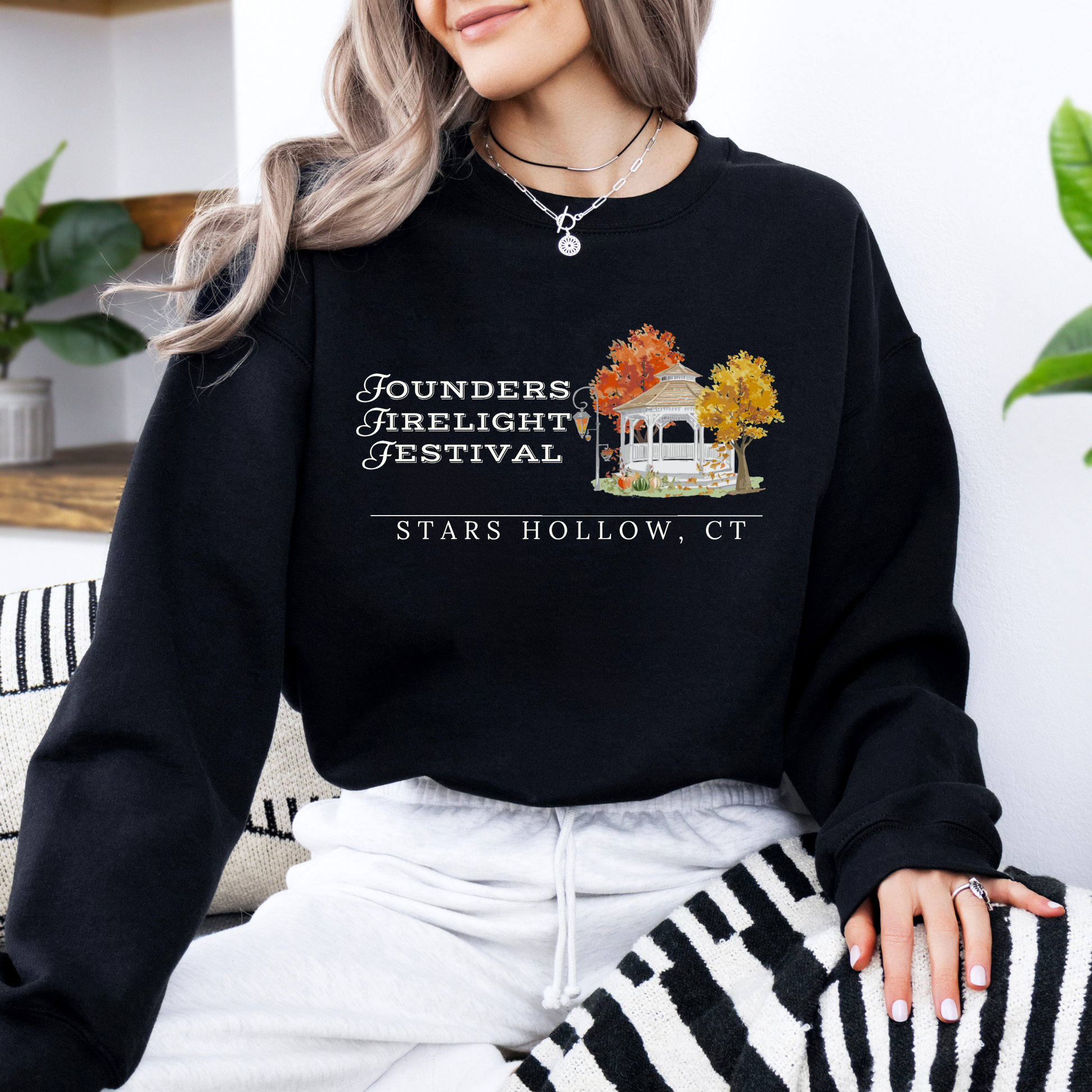 Step into the charm of Stars Hollow with this cozy crewneck, inspired by one of the town’s most beloved events — the Founders Firelight Festival. Featuring a whimsical gazebo surrounded by trees, just like the one in the heart of town, this sweatshirt is perfect for fans who want to keep the Gilmore Girls magic close. Ideal for coffee runs, fall strolls, or binge-watching your favorite episodes.