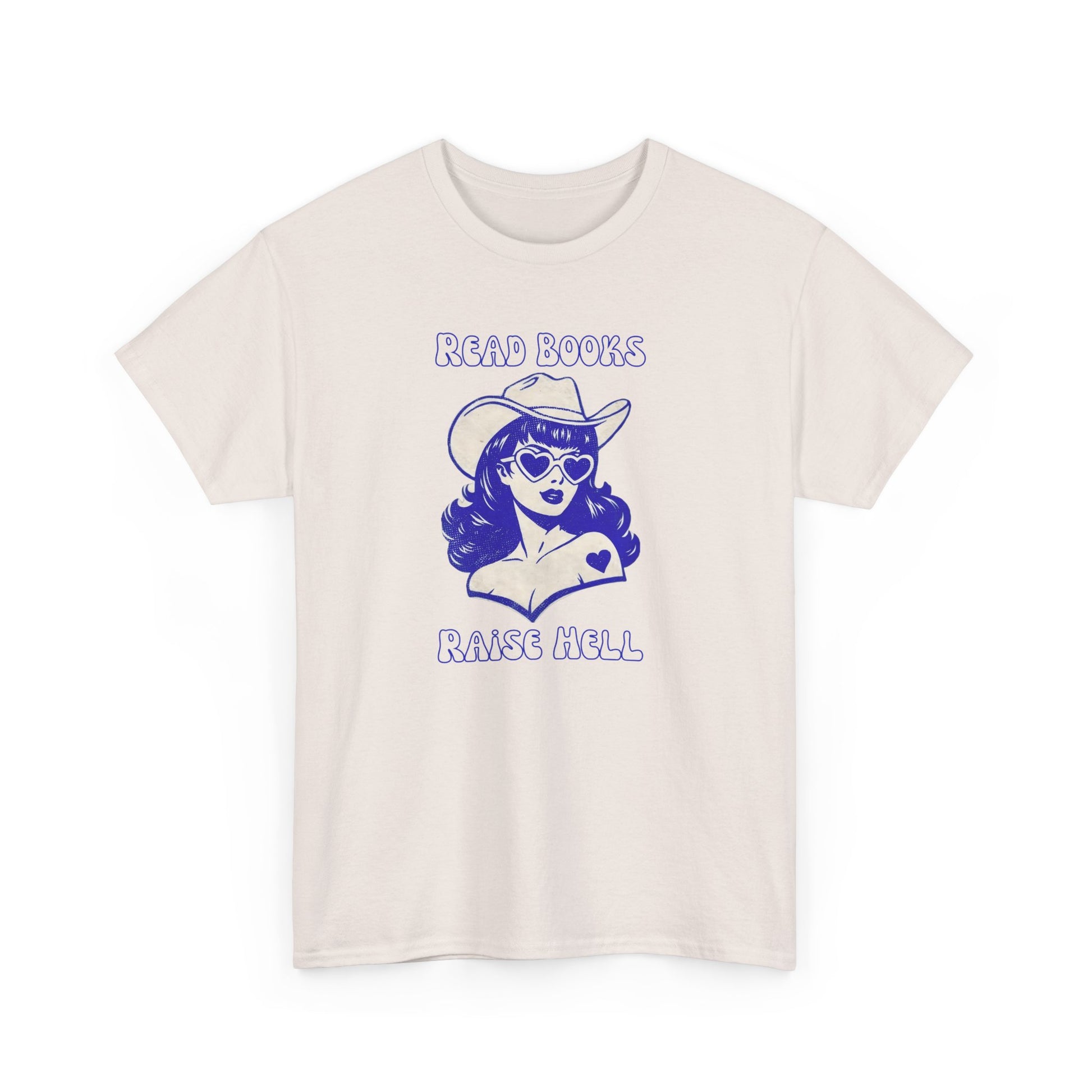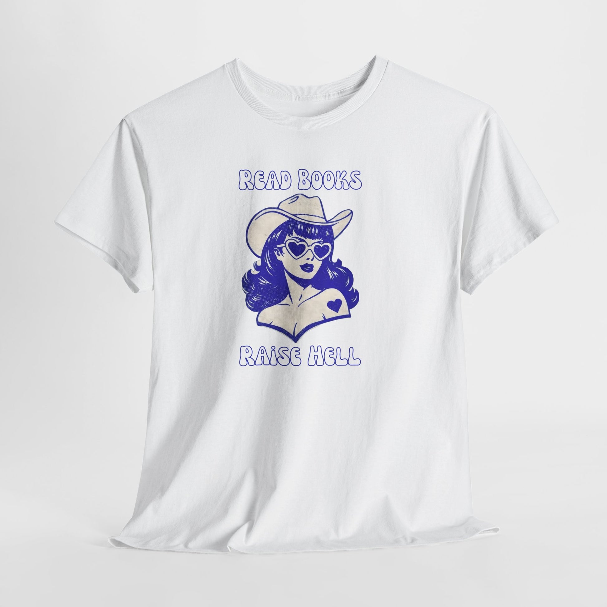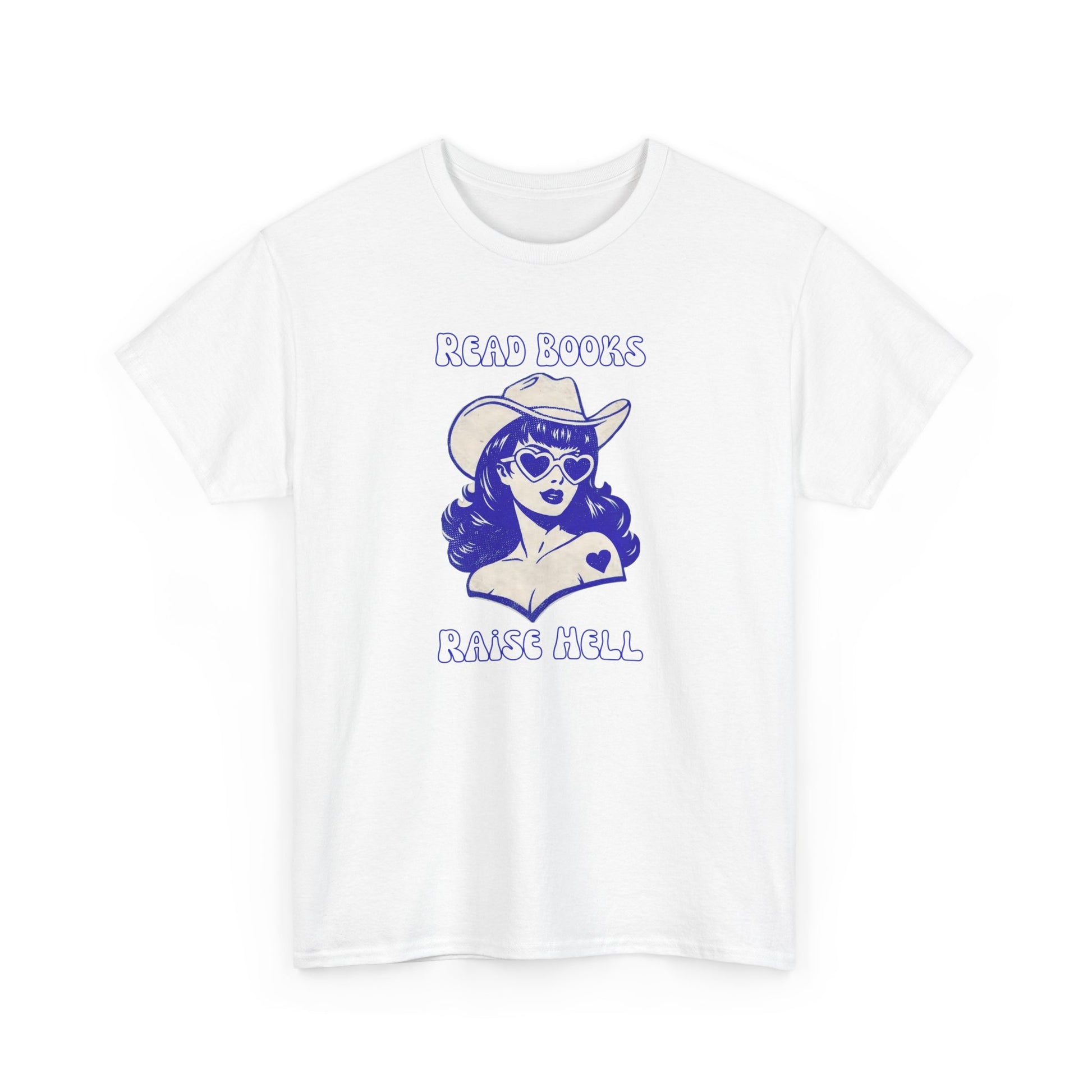 Turn the page and turn heads. This bold graphic tee features a retro cowgirl in heart-shaped shades—equal parts bookworm and rebel—paired with the cheeky phrase “Read Books, Raise Hell.” Soft, comfy, and full of personality, it’s the perfect shirt for readers who love romance, chaos, and a little main-character energy.