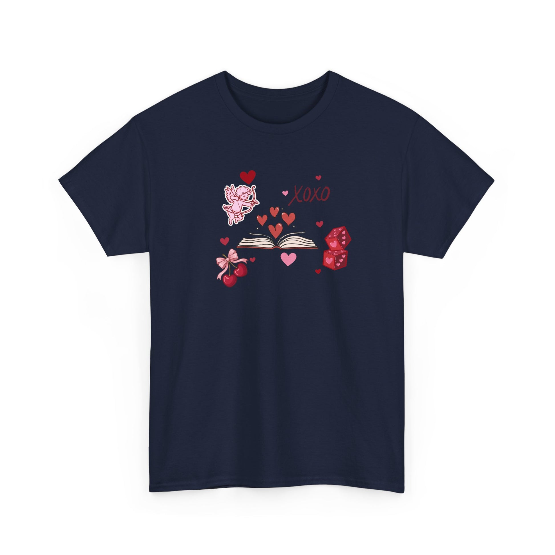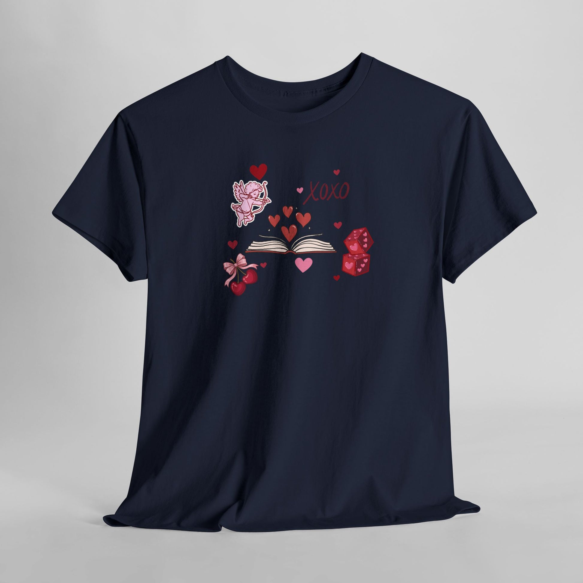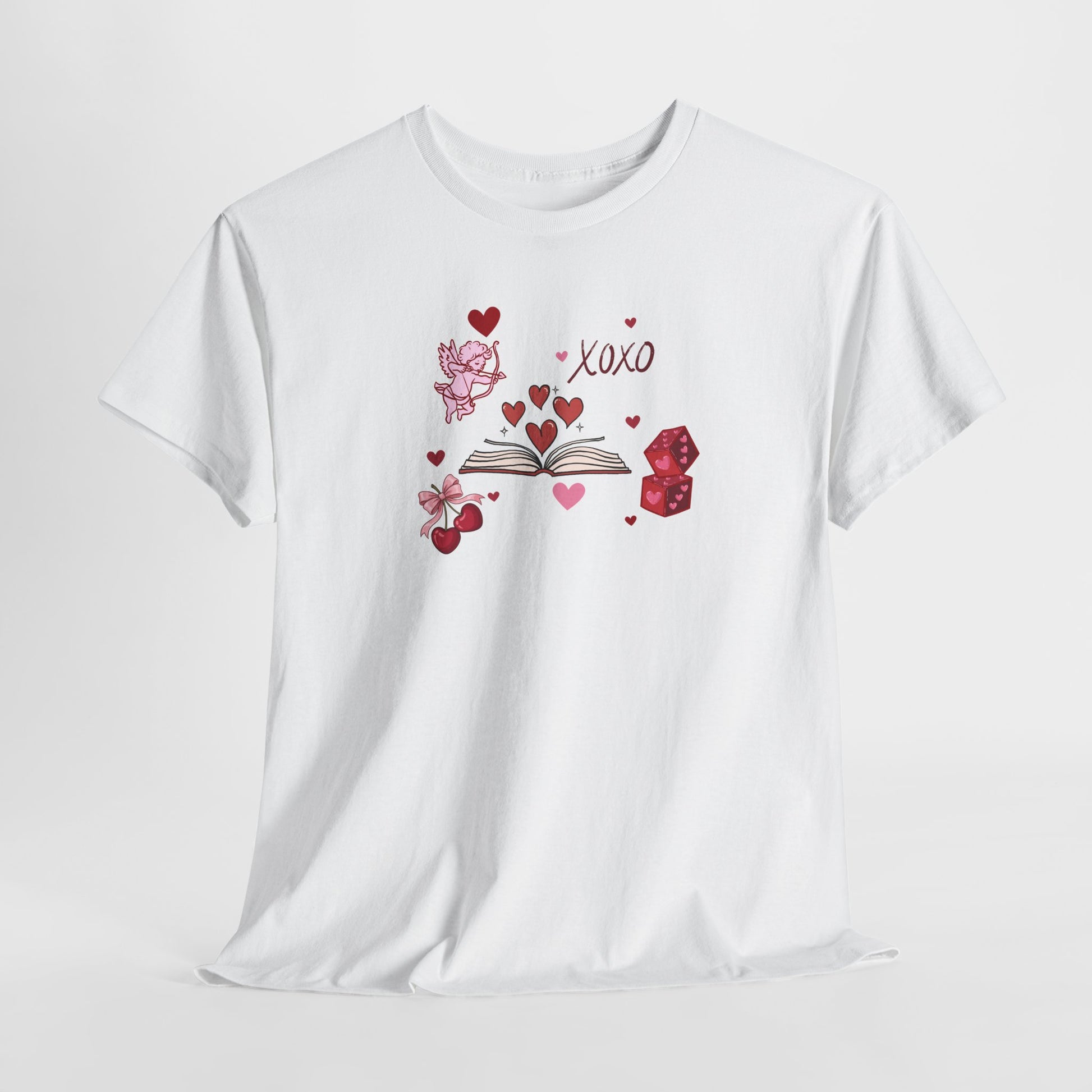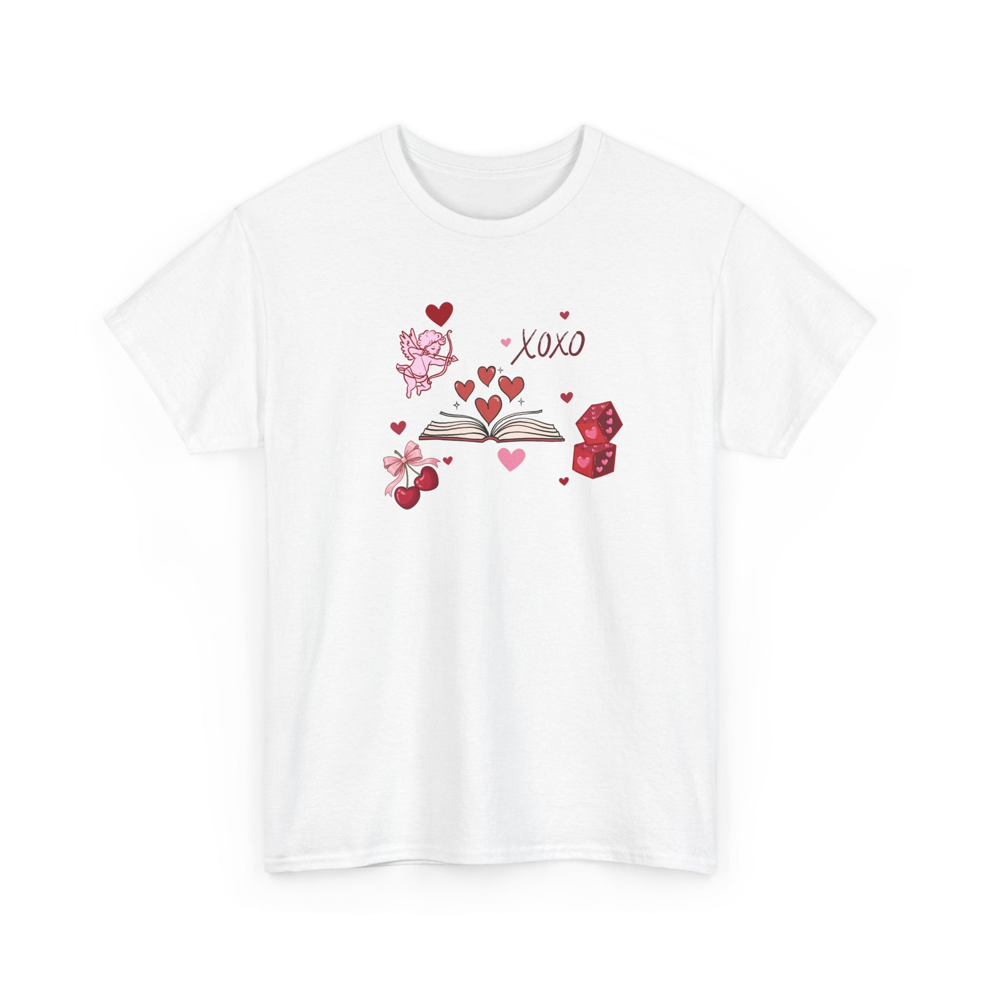 A little romance, a lot of books. This Valentine-inspired t-shirt features an open book bursting with hearts, paired with sweet details like Cupid, cherries, love notes, and a playful “XOXO” — because nothing says love like getting lost in a good story.